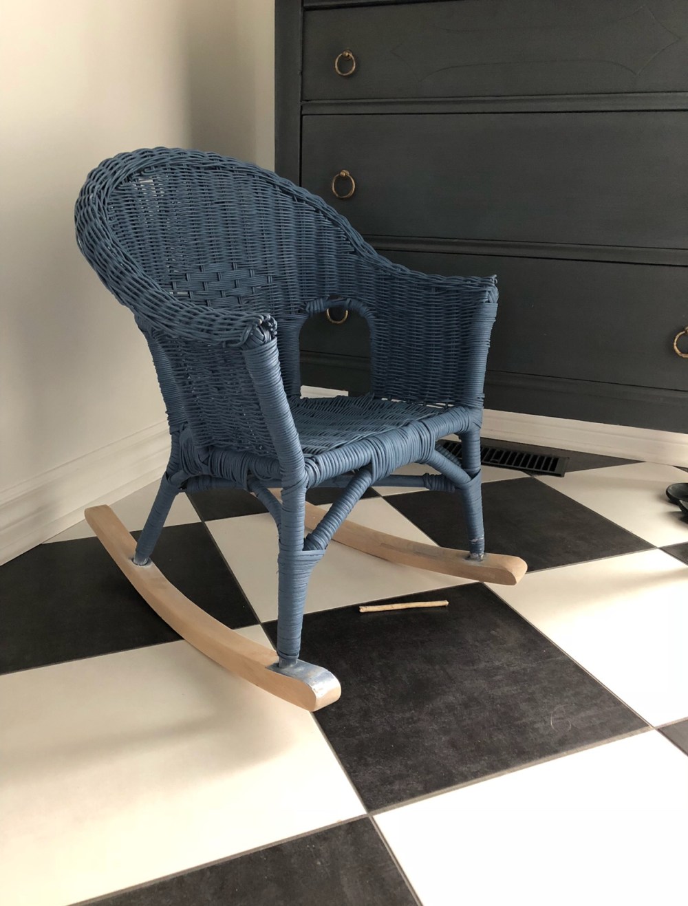 Although I thoroughly enjoy white, the paint was looking ratty while also giving the piece a very dainty and traditional look (white rattan furniture can look quite Victorian). Since I planned to add it to the front porch and wanted some colour to warm the space up (and coordinate with the other chair I had fixed for myself), I decided to paint it a dark powdery blue.