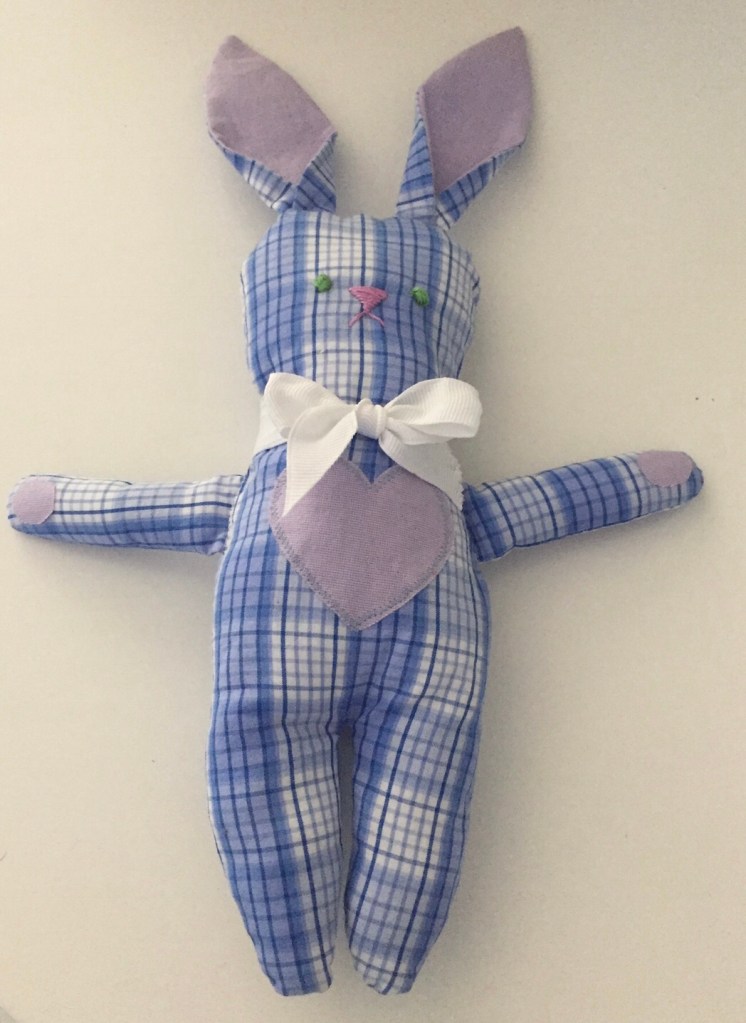I love to recycle and so when an item of clothing no longer serves us but I like the pattern or colour, I find it hard to donate it. Once I came across this Martha Steward pattern for a bunny rabbit, I found a purpose for some of my fabric 🙂 it’s a very simple pattern which can easily be sewn by hand. The rabbits can be personalized with little touches (I usually sew a heart on the front and here I added little pads in the bunny’s paws) and make pretty gifts. Here is one of my latest ones 🙂