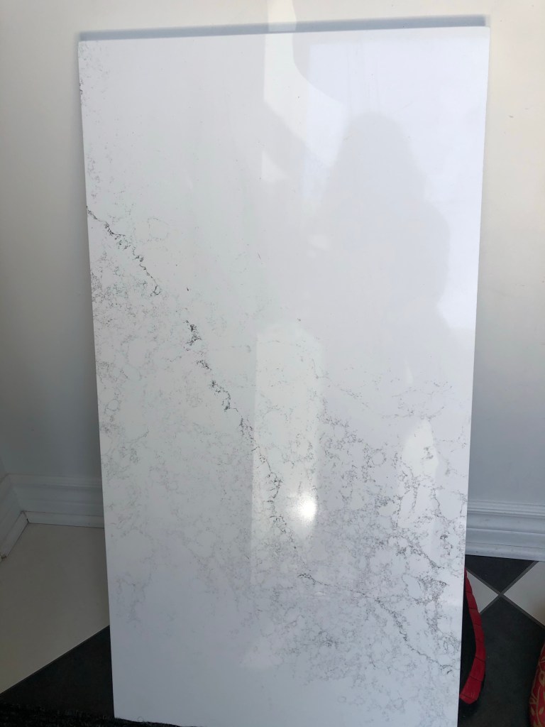 After using the dresser as it was for a few years, the “someday” came 🙂 I was offered a piece of white quartz, cut from counter remnants, to fit the top of the dresser. Below is the stone I chose.