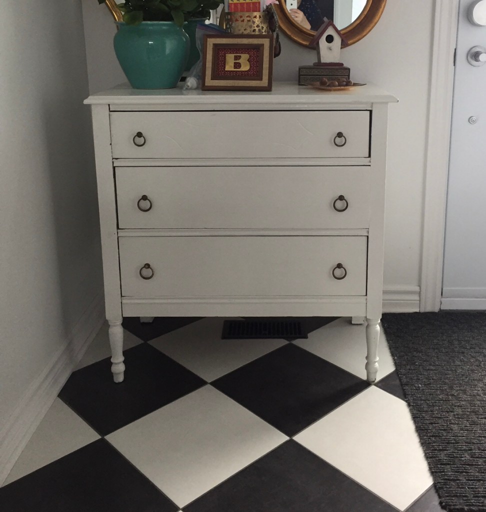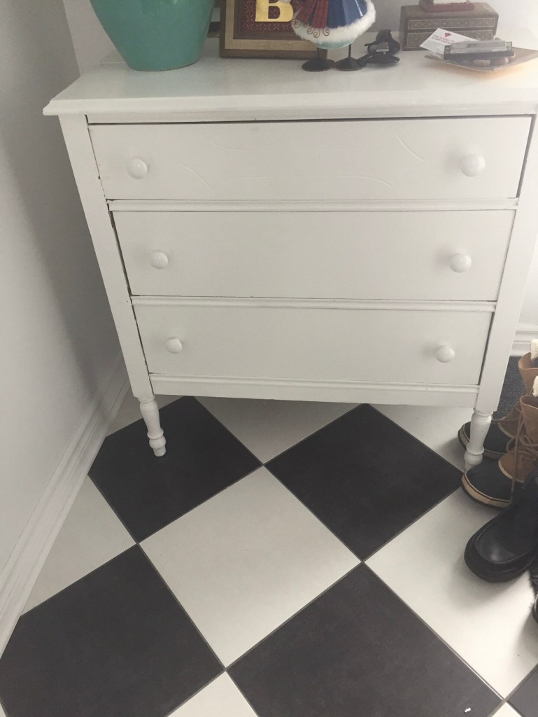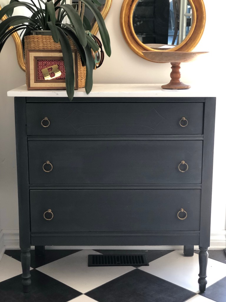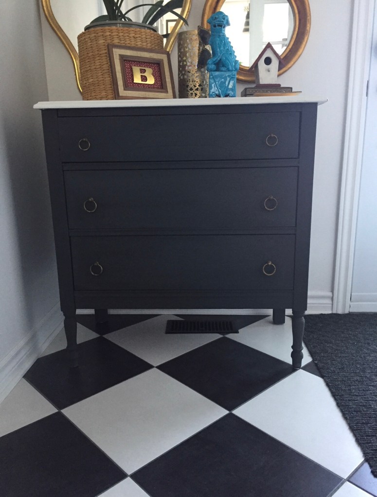 The result was what I had hoped for, the look a little more formal, to suit the pattern of the floor. Someday I thought, a marble or quartz top would add a last touch as the existing wooden top was worn and didn’t quite cover the whole dresser top (there was a gap at the back that it didn’t cover).