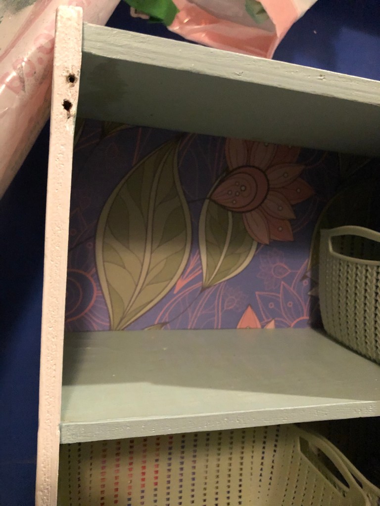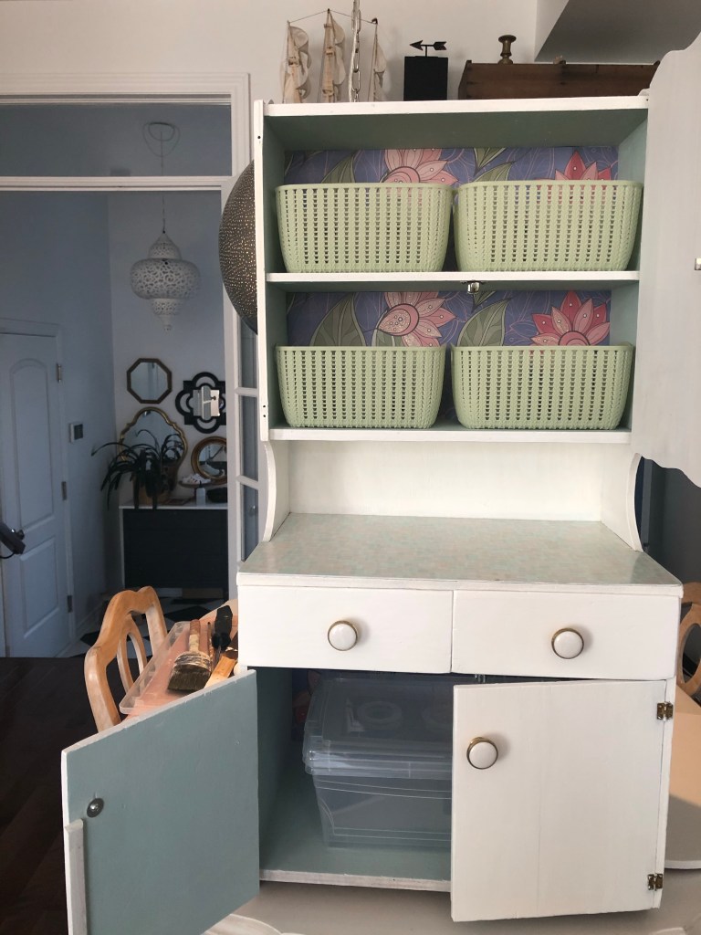 I liked the result but as this is a child’s cabinet, it needed to be more fun still. Off I went to hunt for storage bins and perhaps some paper to line the back of the cupboard with.