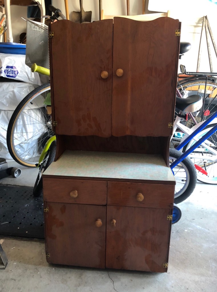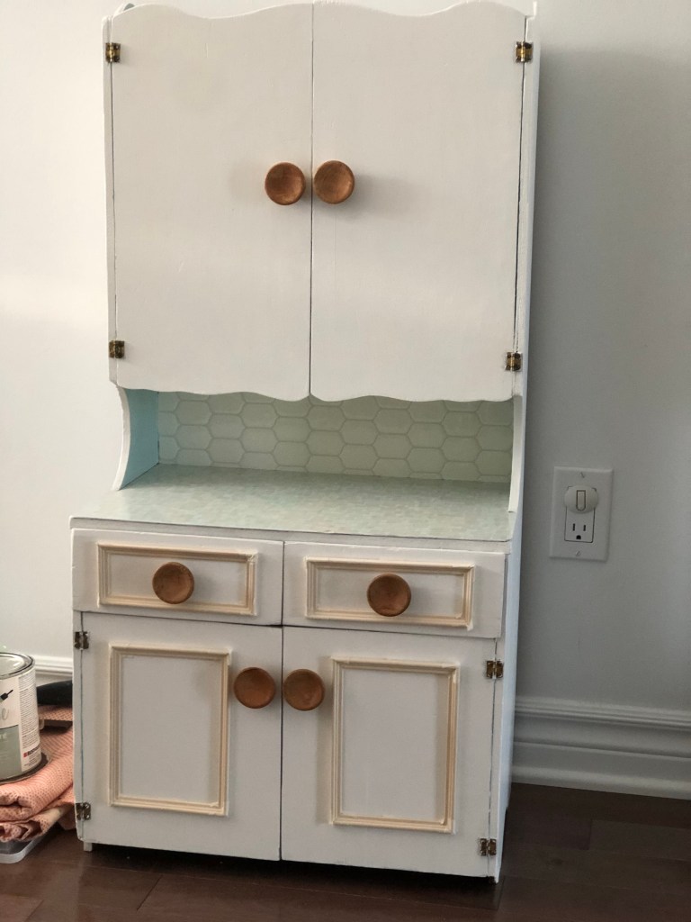 Then… one of the upper cabinet doors fell off, onto the garage floor. This cabinet was starting to give me a run for my money! Of course this sort of thing can happen when you’re working with second hand stuff. Therefore, it is a must to arm yourself with patience and persistence to find design solutions as well as practical ones when needed (gotta flex them creative muscles). At least it didn’t fall off once in my clients hands!