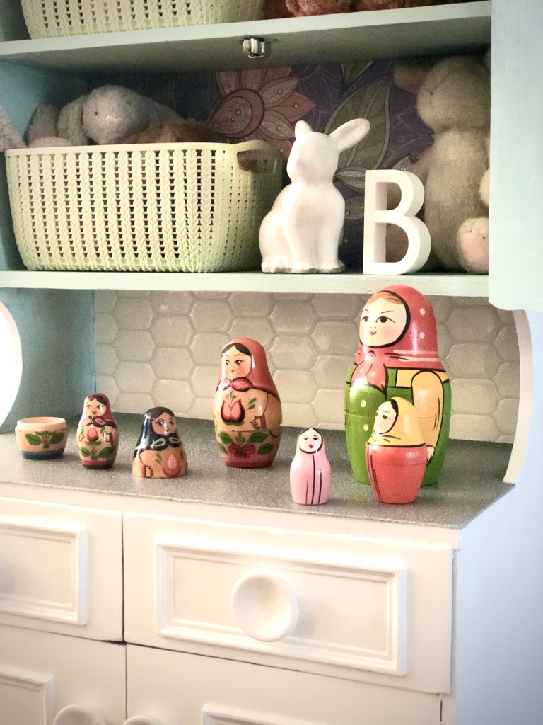 I found some good containers (baskets and containers are a must for storage of little figurines, Barbies etc). When it came to the paper, all I could find was a pretty gift bag, but it would do the job beautifully. Also, I felt that different handles would give the cabinet more punch so digging into my stash I went once again. I came up with old kitchen cabinet door handles.