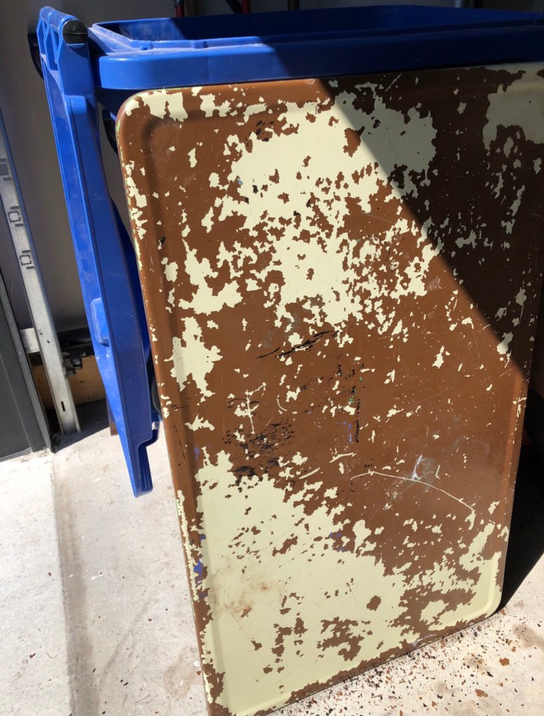 I sanded the surface lightly and wiped it clean with rubbing alcohol so that the metal paint would adhere properly. I painted it with a primer after taping off the green edge (where the few worn spots would not be covered, to preserve some of the character). I painted several coats of pure white tremclad metal paint, following the instructions on the can. Overall I’d say I sprayed about five coats. In between, once a coat had dried, I checked for any rough or bumpy patches, which I sanded down with ultra fine sand paper for car body repairs.