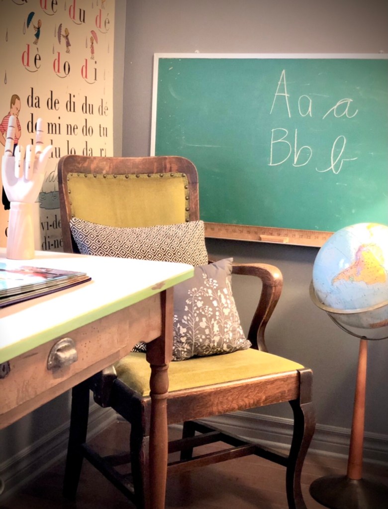 In order to complete the space, I put up a chalkboard and a 1950s classroom poster. I added a second hand pedestal globe I had bought a year or two ago, along with an old oak chair I also had (from a church sale years ago).